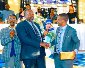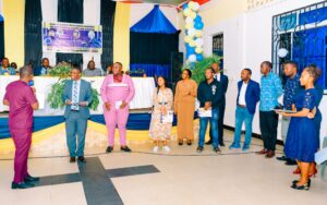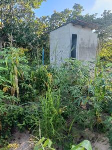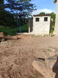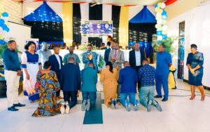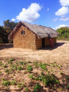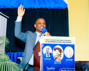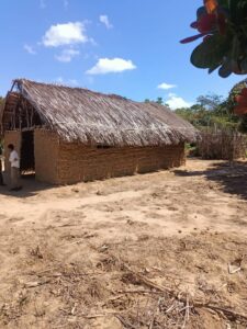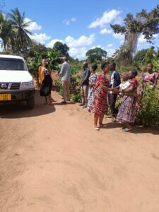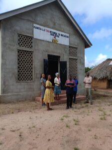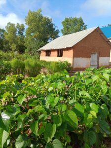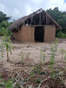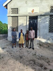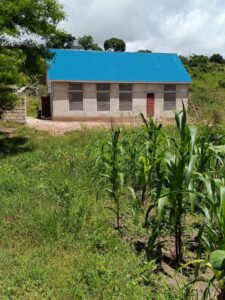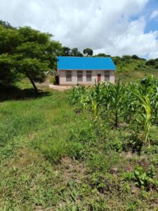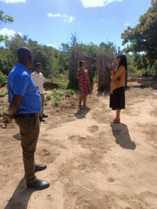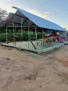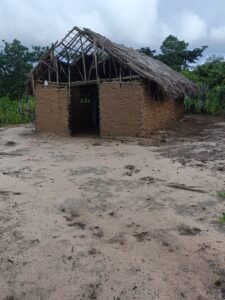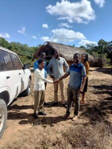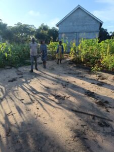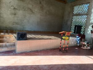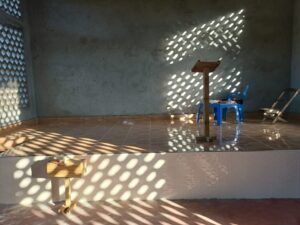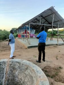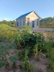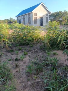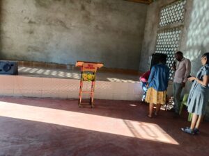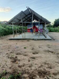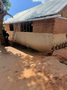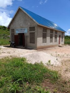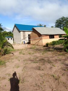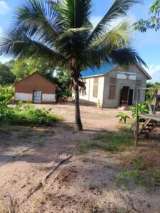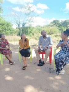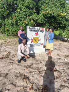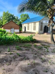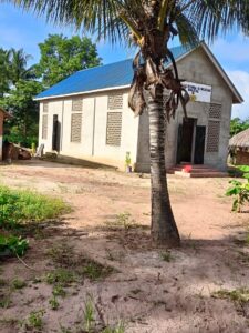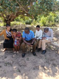 Mchungaji Kiongozi Wa Kanisa la EAGT MITENGO, aliyekaa katikati akitoa maelezo Kwa mmoja Wa Wanakikundi Wa Huduma ya Tujenge Nyumba ya Mungu tarehe 11/07/2023 walipotembelea Kanisani hapo Kwa ajili ya kutathmini uwezekano Wa kujenga Kanisa Mahali hapo.